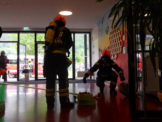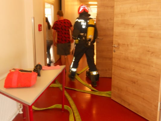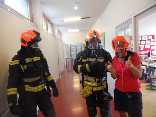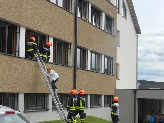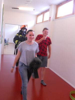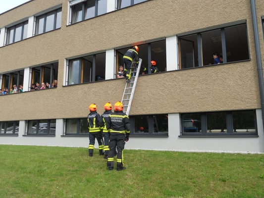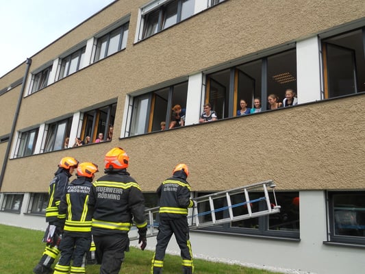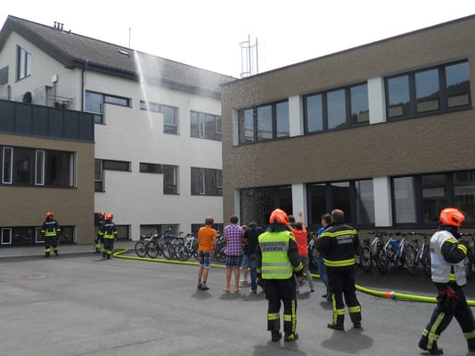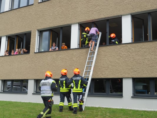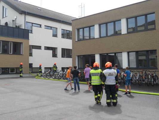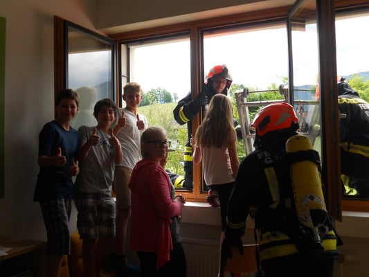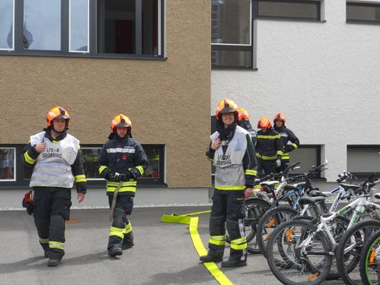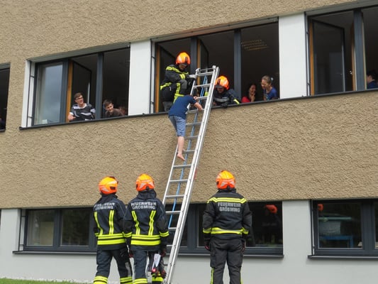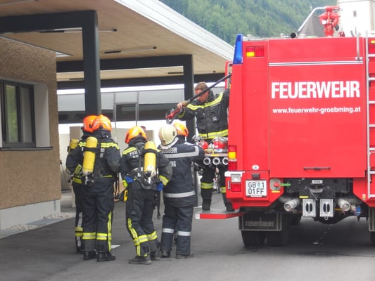 Als um 10.19 Uhr der Alarm in der NMS Gröbming und im ZIS lautstark losging, waren sich die LehrerInnen und SchülerInnen nicht sicher, ob es wirklich brennt oder ob es sich um eine Alarmübung handelt. Natürlich war es nur eine großangelegte Übung! Bei dieser behördlich angeordneten Alarmübung waren die FF Gröbming, unter Leitung von ABI Gerd Bartl, und die FF Winkl unter der Leitung von HBI Gerhard Seebacher verantwortlich. Mit der Annahme - Brand im Knaben WC - wurden drei Klassen durch die enorme Rauchentwicklung im 1. Stockwerk eingeschlossen. Sie mussten mit einer Leiter über das Fenster gerettet werden. Zeitgleich drangen Feuerwehrmänner mit schwerem Atemschutz zu den eingeschlossenen SchülerInnen und LehrerInnen durch und konnten einzelne SchülerInnen mit Atemschutzmasken ins Freie bringen. Die gesamte Organisation wurde von unserem Bürgermeister, Herrn Alois Guggi, überprüft. Er bedankte sich bei der Nachbesprechung für den reibungslosen Ablauf und für die exzellente Arbeit der freiwilligen Einsatzkräfte und der Brandschutzbeauftragten Karin Liebhart und Barbara Rust.