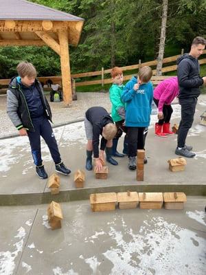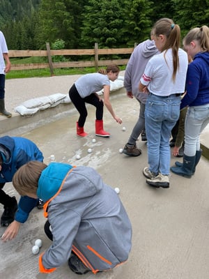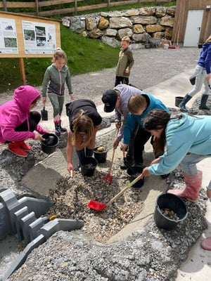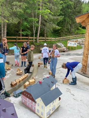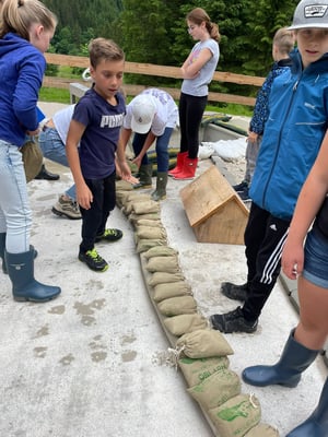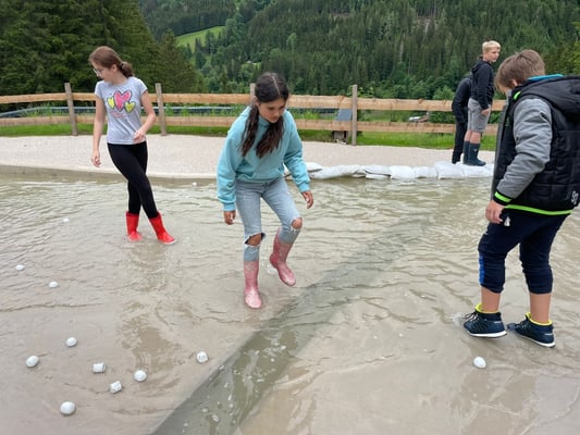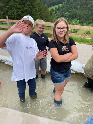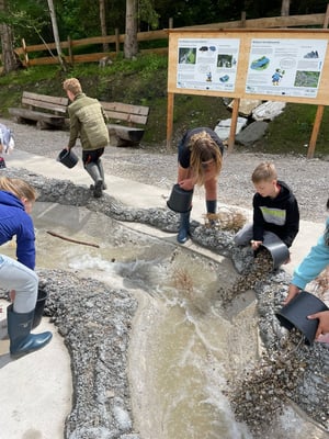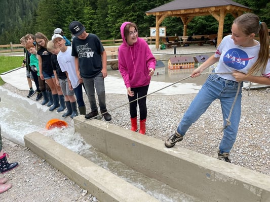 Das Highlight des Tages war die Nachahmung einer Überschwemmung des Ortes Öblarn. Dabei durften die Schüler und Schülerinnen eine Mure mit Kieselsteinen, Ästen und Holzstecken nachstellen. Zum Schluss hatten die Schüler noch die Möglichkeit, beim "Wassereimerziehen" ihre Kräfte unter Beweis zu stellen.