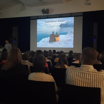 Vor über 150 interessierten Schüler:innen entführte er uns in die eisigen Gefilde der Arktis und gewährte uns einen faktenreichen Einblick in seine Reise nach Longyearbyen auf Spitzbergen.