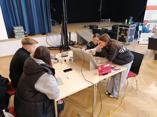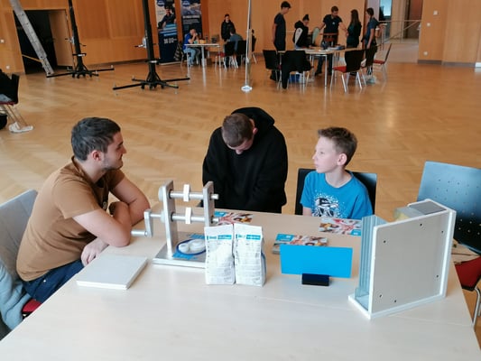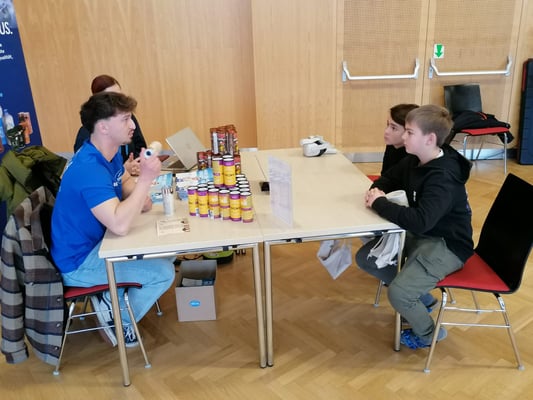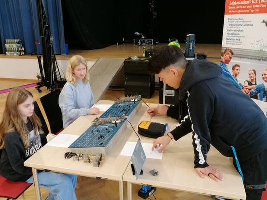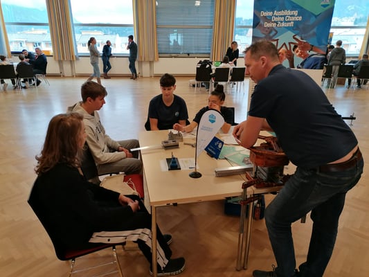 Die Schüler: innen durften in einem Stationsbetrieb die Stände der einzelnen Firmen besuchen, an denen sie neben kleinen technischen Aufgaben auch Zeit fanden, sich mit Lehrlingen/Gesellen zu unterhalten.