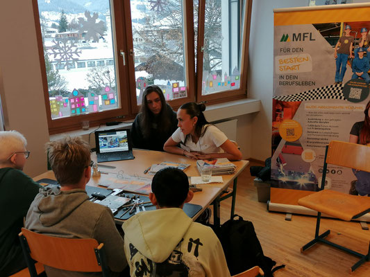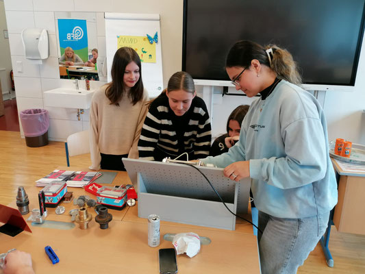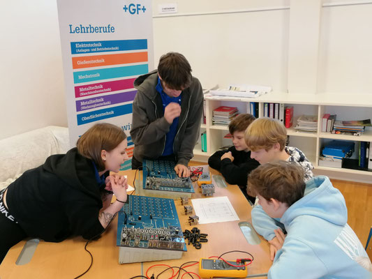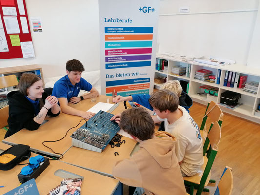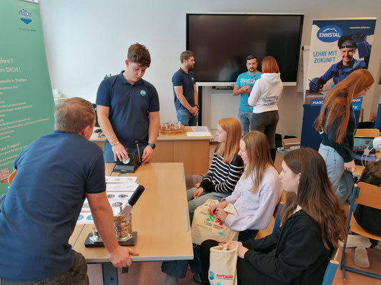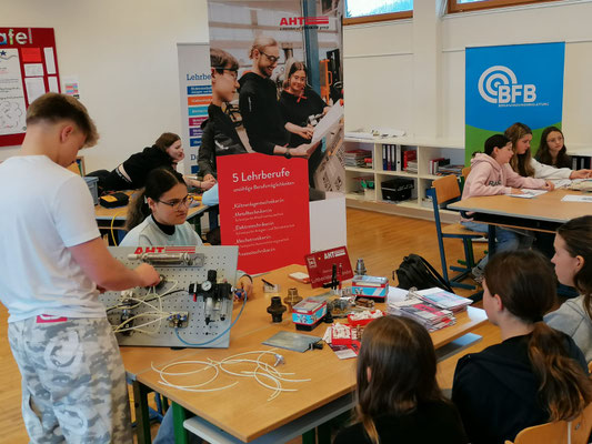 Die Schülerinnen und Schüler durften in einem Stationsbetrieb in Kleingruppen die Stände der einzelnen Firmen besuchen, an denen sie neben kleinen technischen Aufgaben auch Zeit fanden, sich mit Lehrlingen/Gesellen zu unterhalten.