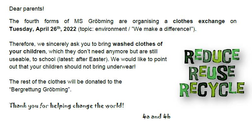 Zum immerwährend aktuellen Thema Umweltschutz veranstalteten die 4. Klassen einen „Kleidertausch“, bei dem Jedermann und Jederfrau Kleidung mitbringen durfte. Aufbereitet in der Aula fand dann am Dienstag, 26. April ein kostenloses „Shopping“ statt. Viele Kinder freuten sich über „neue“ alte Stücke für ihren Kleiderkasten. Die übriggebliebene Kleidung spenden wir an unsere heimische Bergrettung (Fetzenmarkt). Alle Kinder und unsere Umwelt bedanken sich herzlich bei den Eltern, LehrerInnen und SchülerInnen für die großzügigen Kleidergaben!